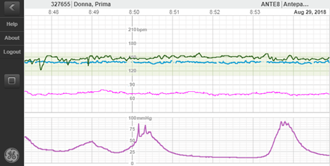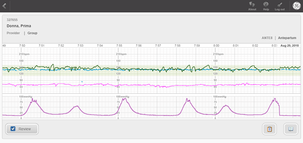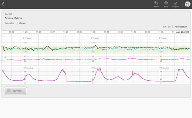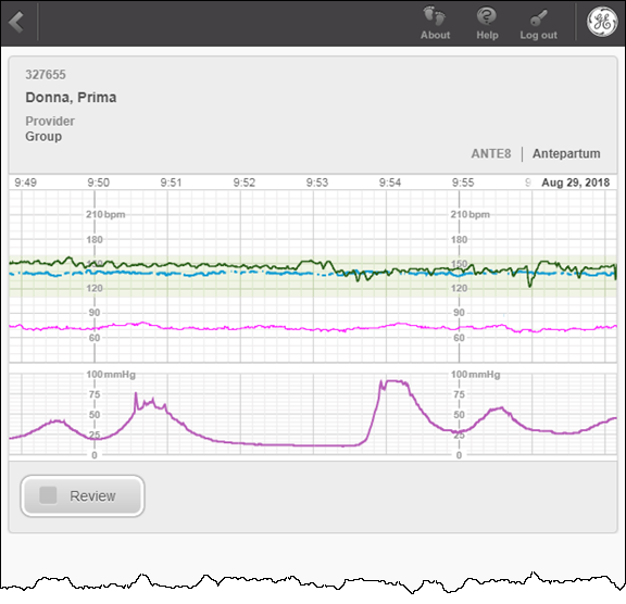 The Patient Details View displays a patient’s identifying information (patient name, patient ID, unit, bed, patient’s provider’s name, and provider group) as well as the FHR1, FHR2, MHR, and UA data. The default anticipated fetal range in Centricity Perinatal Designer is 110-160, which appears as a shaded section on the fetal grid. If anticipated fetal heart rate range is changed in Centricity Perinatal Designer, it will be reflected in the fetal grid. When the configuration text file has numeric values rather than Centricity Perinatal Designer, those values will be displayed on the fetal grid.